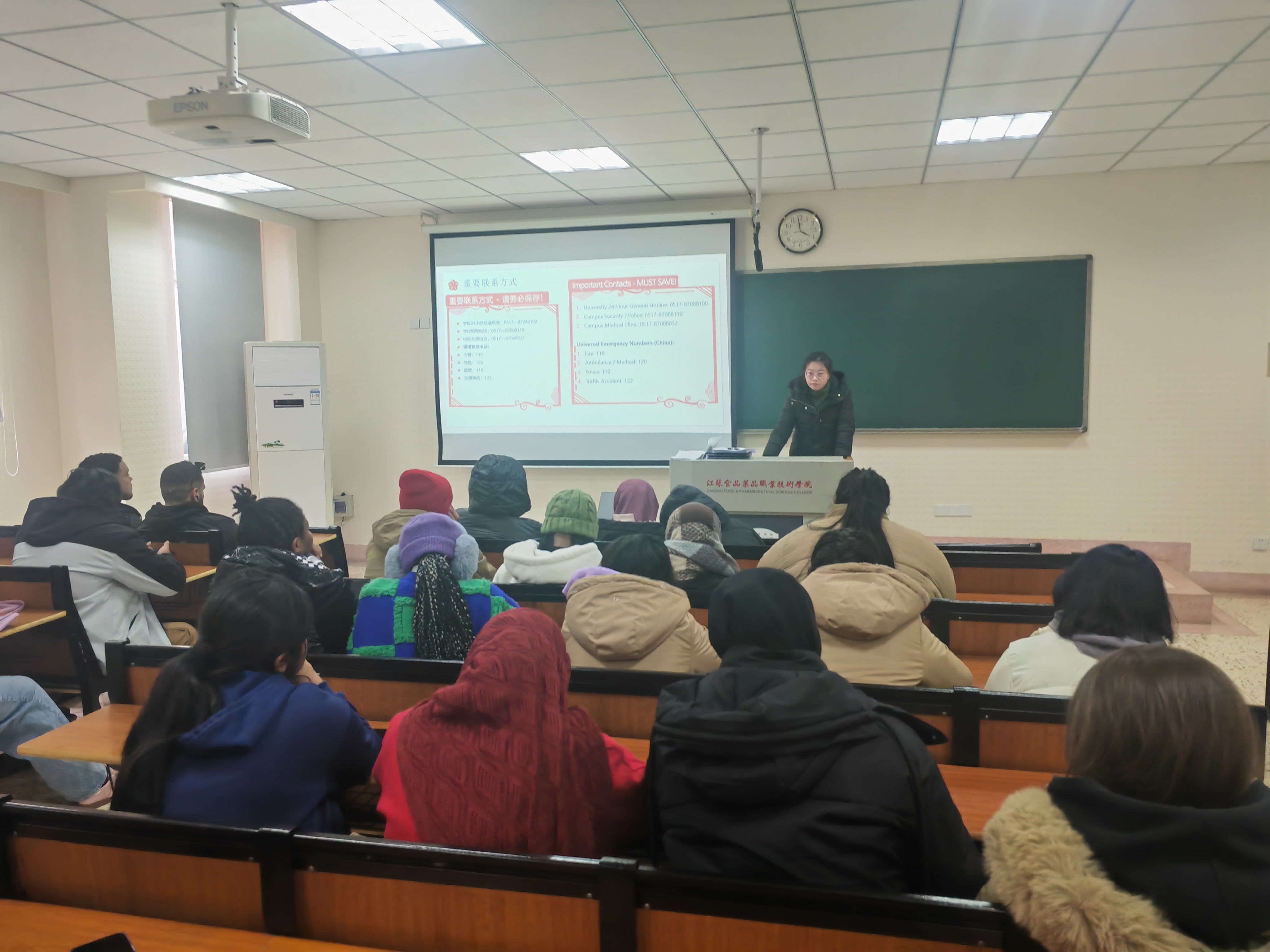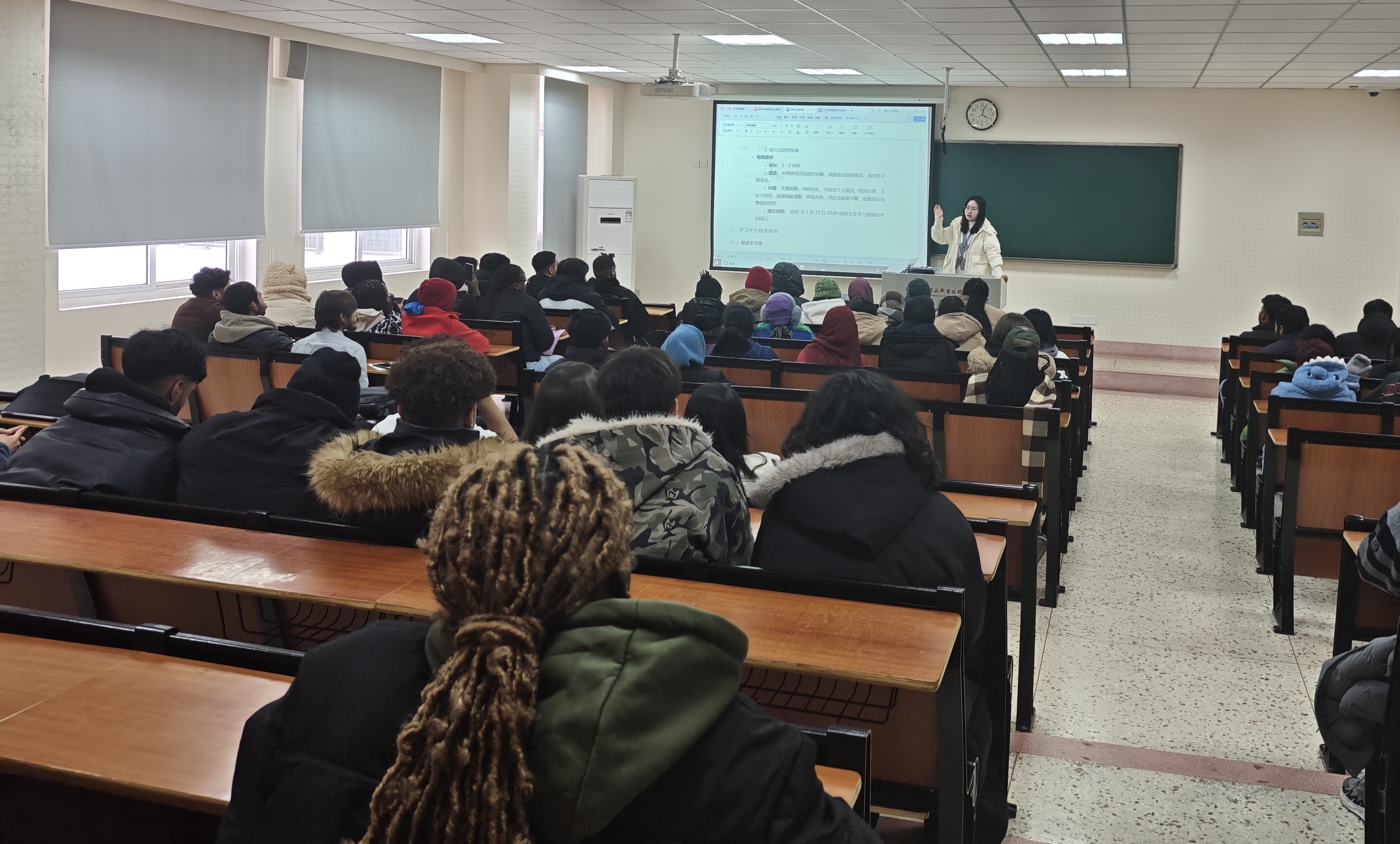 随后,刘姝老师围绕寒假期间的学习与实践安排进行了详细说明。她首先介绍了“留学生寒假汉语学习强化方案”,鼓励同学们在假期保持学习连续性,积极利用各类资源提升汉语能力;接着她重点阐述了“2026年寒假留学生淮安文化探访实践作业方案”,她鼓励同学们在保障安全的前提下,利用假期深入探索淮安的历史文化与风土人情,通过小组合作的方式,在实践中增进交流、提升汉语应用能力,并进一步熟悉和融入本地生活。