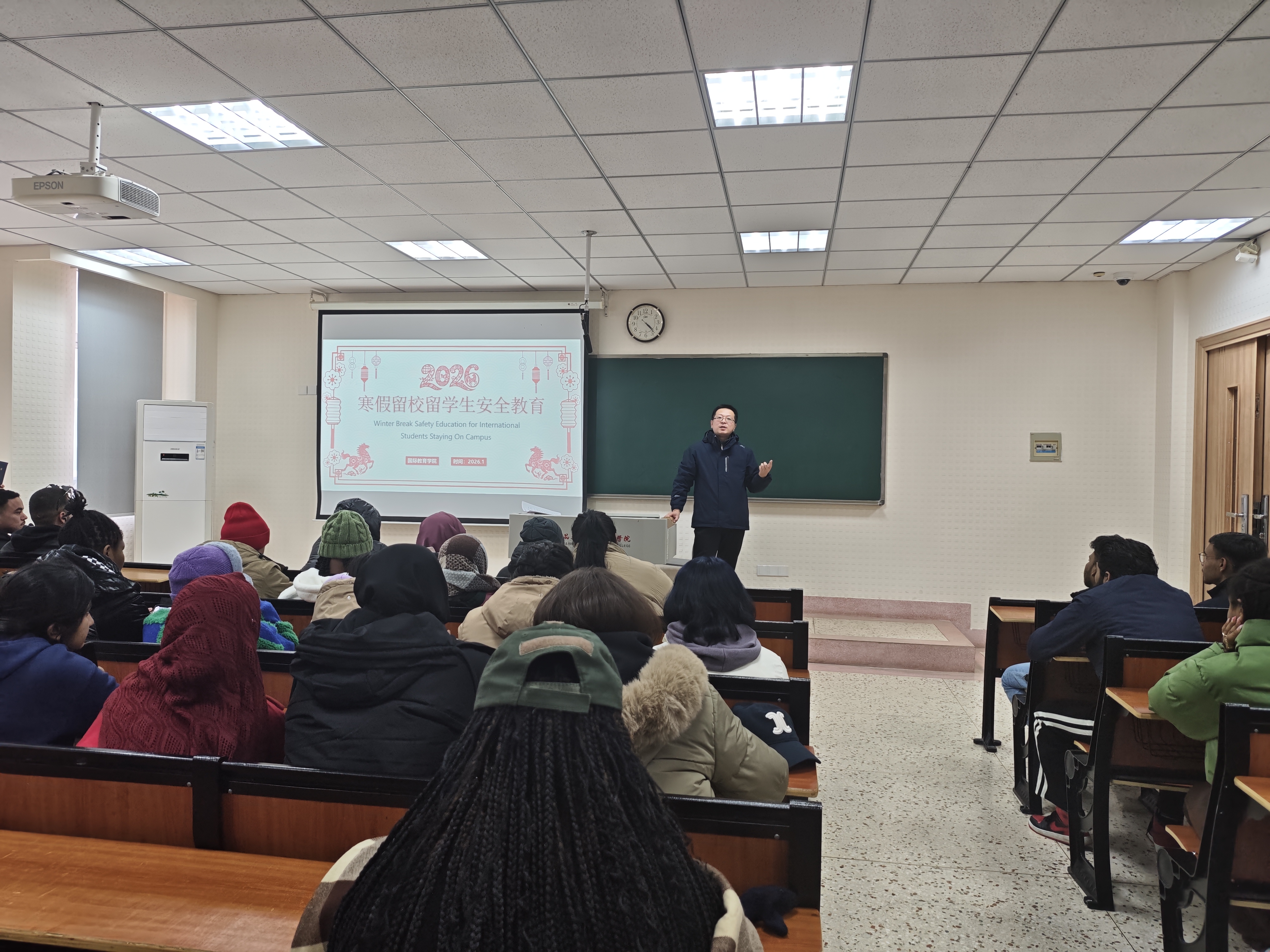 2026年1月26日,为保障留学生度过一个安全、充实、愉快的寒假,国际教育学院专门为寒假留校留学生组织了一场全面的安全教育会议。会议围绕假期安全、文化体验与学业引导等多个维度展开,国教院教师代表与留校学生共同参加。