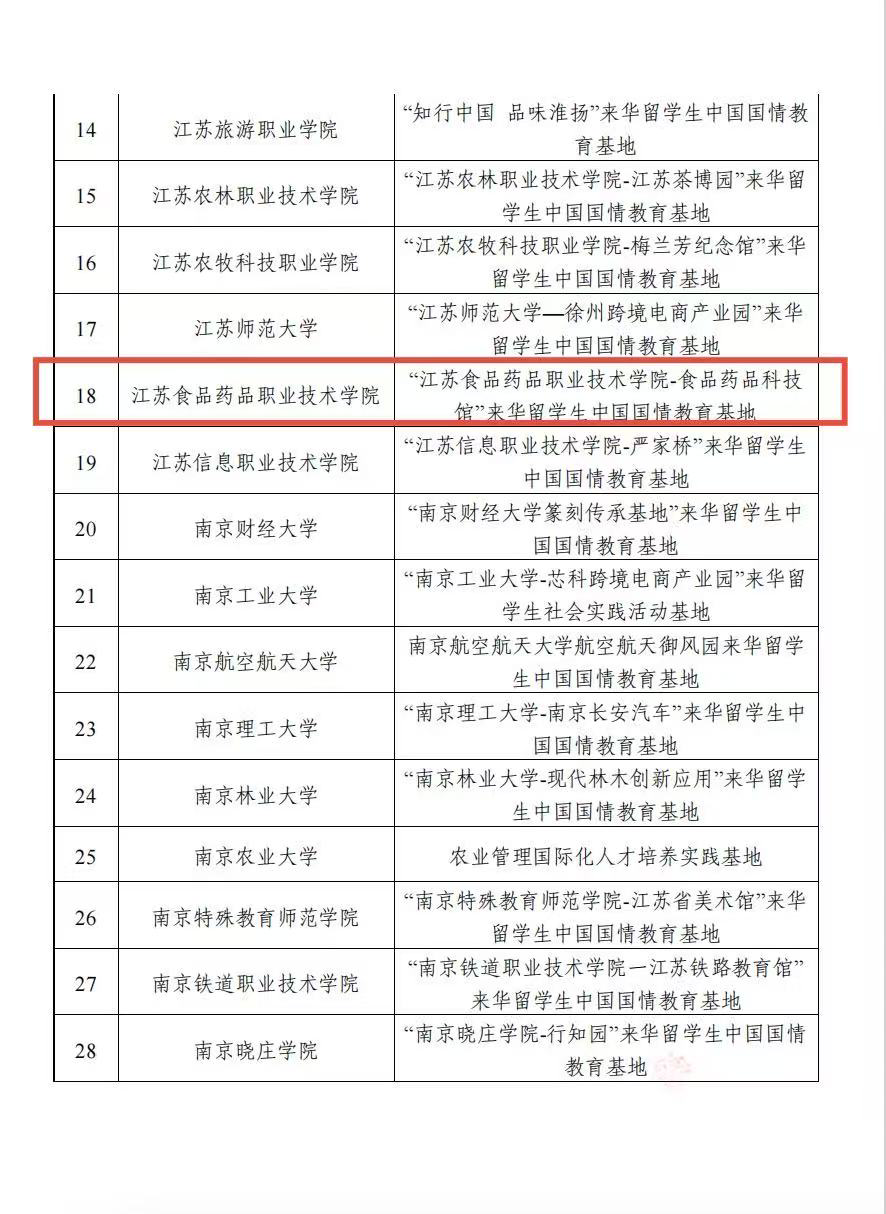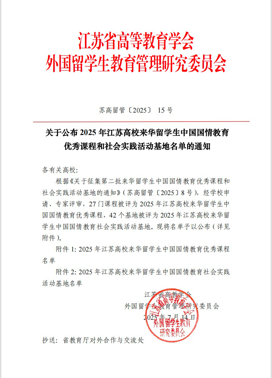 近日,江苏省高等教育学会外国留学生教育管理研究委员会发布了《关于公布2025年江苏高校来华留学生中国国情教育优秀课程和社会实践活动基地名单的通知》(苏高留管〔2025〕15号),我校“食品药品科技馆”获评江苏高校来华留学生中国国情教育社会实践活动基地。