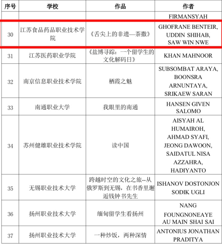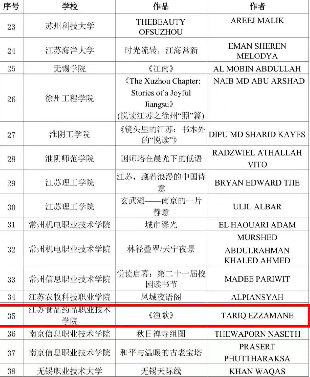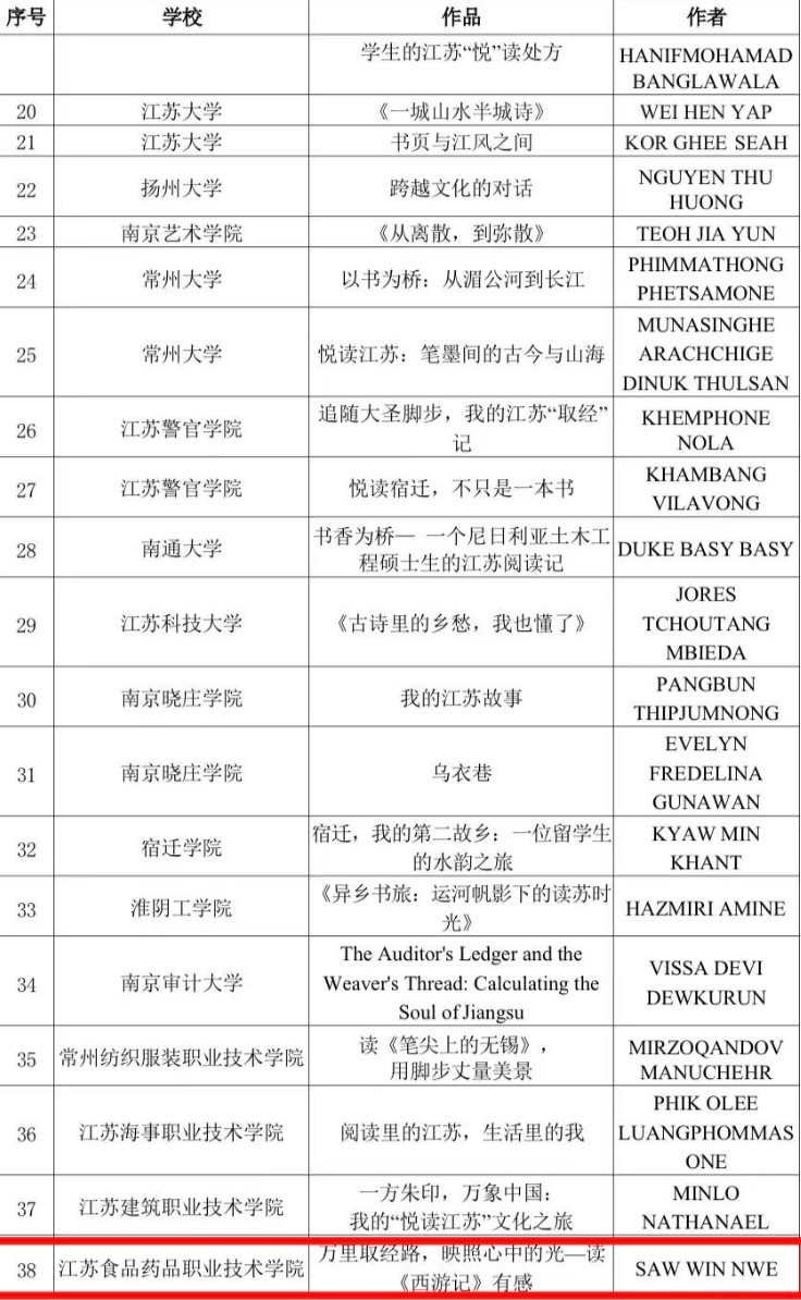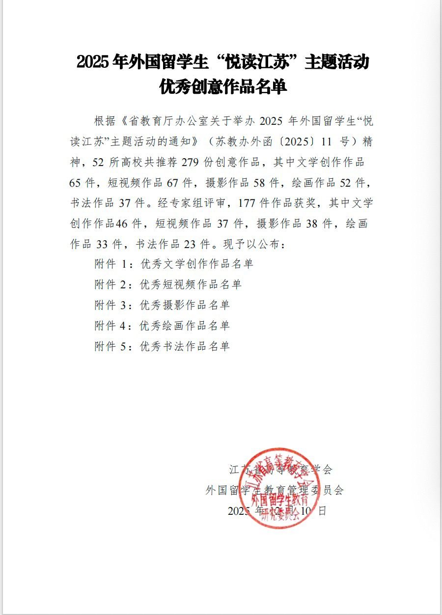 近日,由江苏省教育厅指导、江苏省高等教育学会外国留学生教育管理委员会主办的2025“悦读江苏”主题活动评选结果正式揭晓,我校三名留学生荣获佳绩。缅甸留学生SAWWINNWE的作品《万里取经路,映照心中的光—读西游记有感》入选优秀文学创作作品;摩洛哥留学生GHOFRANEBENTEIR、缅甸留学生SAWWINNWE和孟加拉留学生UDDINSHIHAB的作品《舌尖上的非遗—茶撒》入选优秀短视频作品;摩洛哥留学生TARIQEZZAMANE的作品《渔歌》入选优秀摄影作品。